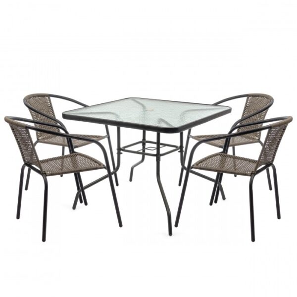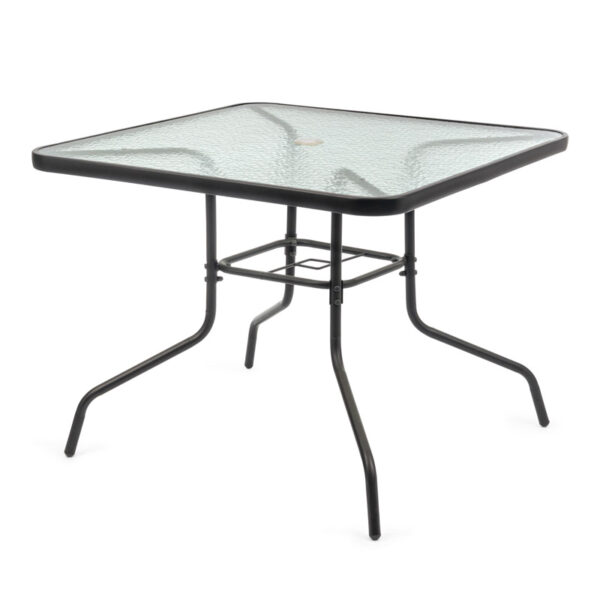 Funktsionaalne klaasplaadiga aialaud mõõtudega 90 x 90 cm, mis on mõeldud ka väikeste õues asuvate lõõgastusalade paigutamiseks. Lauaplaat on valmistatud karastatud klaasist, mis tähendab selle suuremat vastupidavust ja vastupidavust. Koos terasraamiga on mööbel vastupidav ja teenib teid pikka aega hästi. Eeliseks on lauaplaadi sisse asetatud vihmavarju auk, mis stabiliseerib aiavarju.